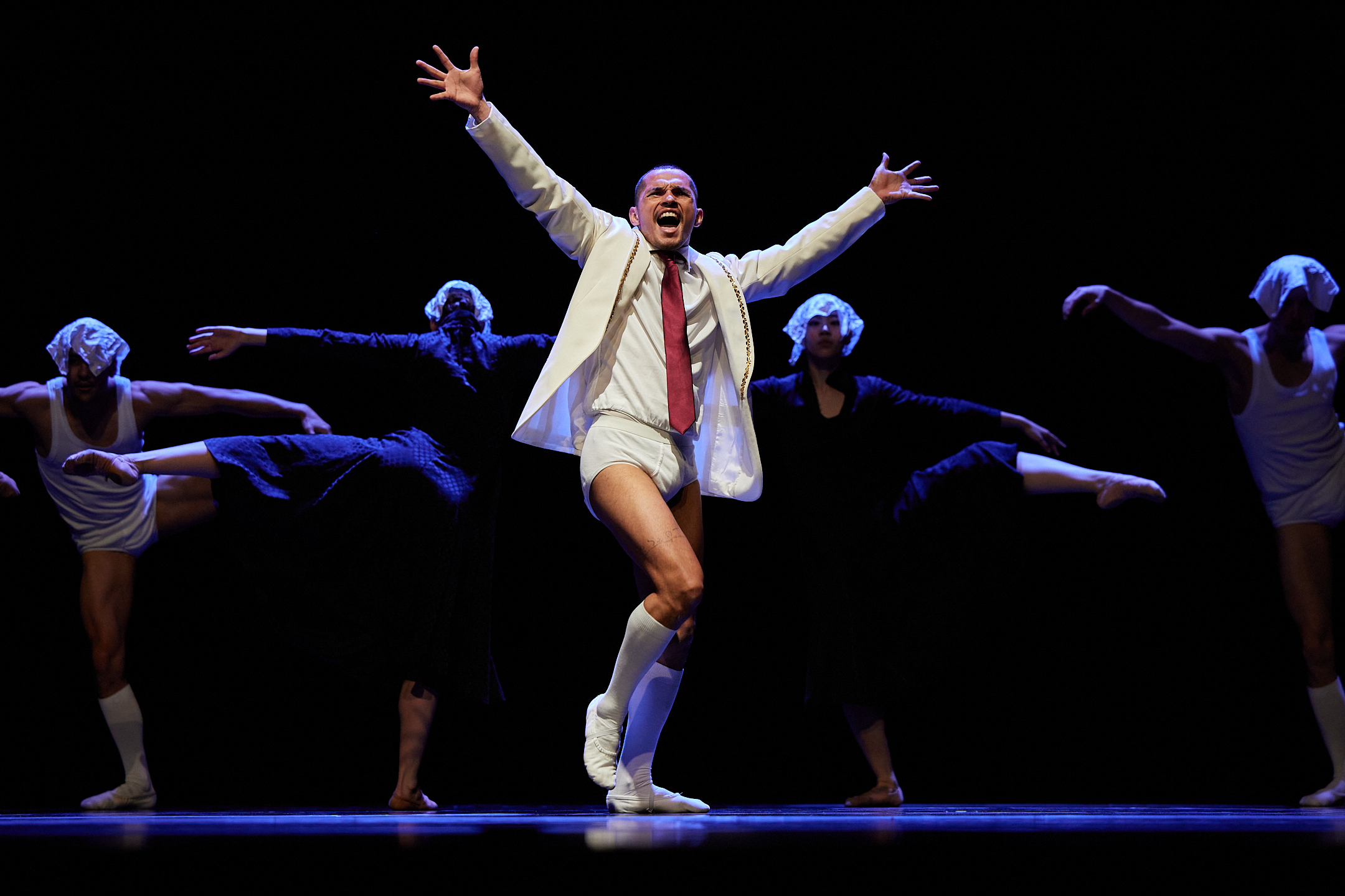 This evening we will present SH-BOOM!, one of the earliest works from the oeuvre of the leading choreographer duo Paul Lightfoot and Sol León, who had success for many years with Nederlands Dans Theater. They drew their inspiration from the satirical black-and-white drawings of the Spanish painter Francisco de Goya. And just as they did so wonderfully and compellingly in their later oeuvre, in this gem they already succeed in combining the dark (irony) and light sides (humor) of life in a masterful way. SH-BOOM!, set to popular songs from the 1930s and 1940s, transports you, as it were, to a theatrical hall of mirrors, in which the ladies dance in flowy dresses and the gentlemen – literally – stand in their underwear.