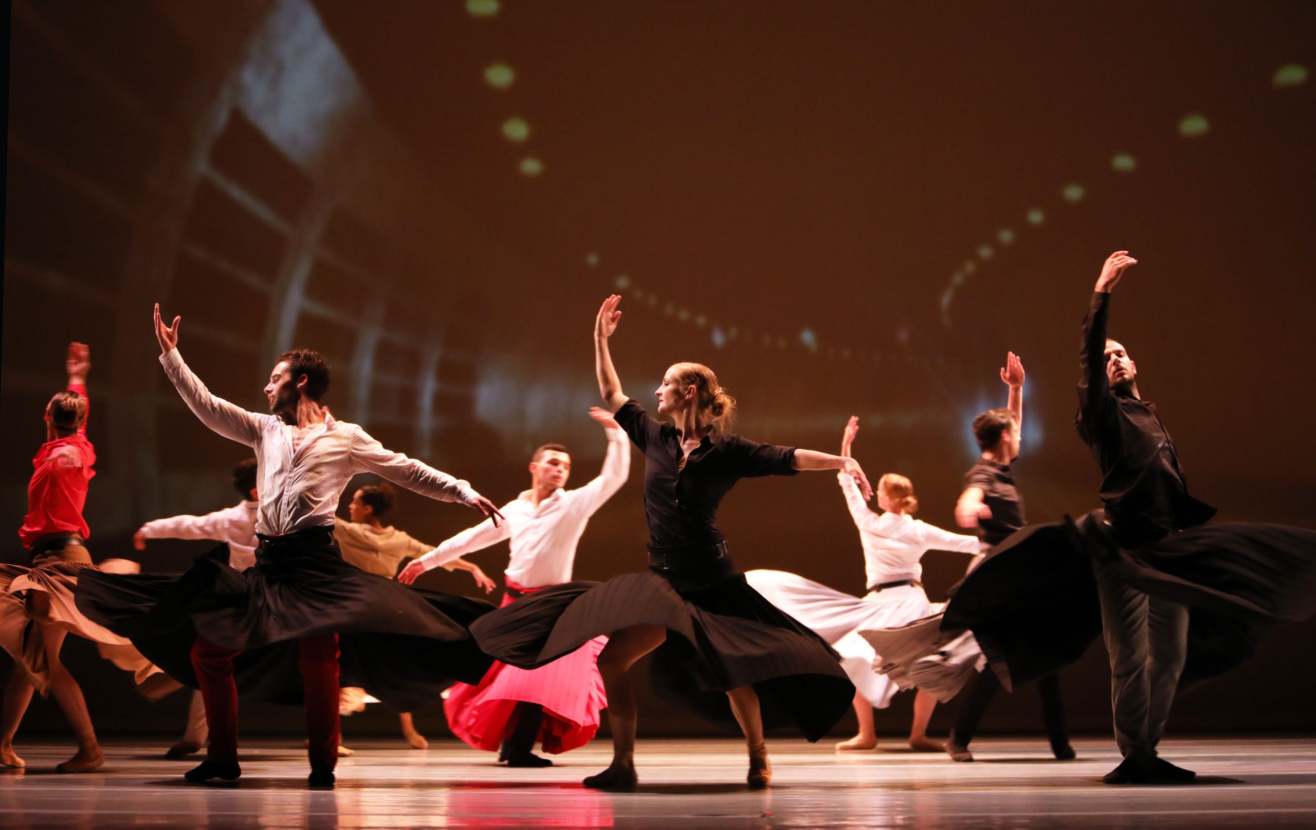This contemporary masterpiece about loss and remembrance is intense. It serves as a tribute to the choreographer’s ancestors. Rustling skirts and fast-paced video projections drive the dancers forward in this meditative performance.