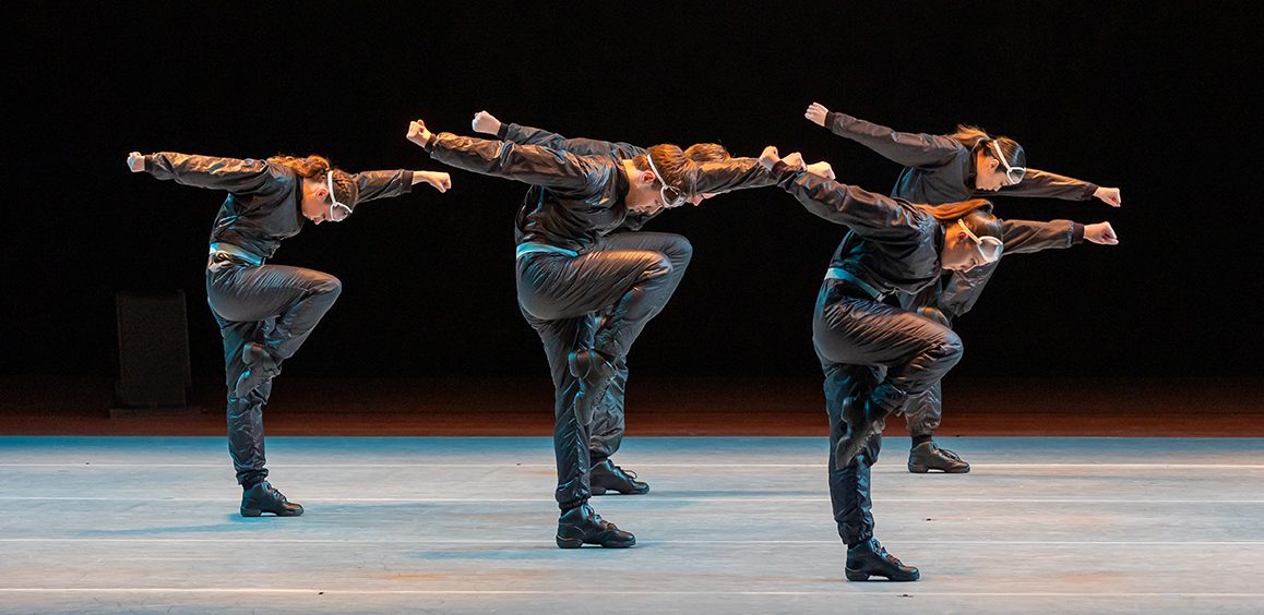 Veertig kleine lampen hangen in acht rijen van vijf boven de dansvloer. Rechts op die vloer staan drie manshoge industriële ventilatoren. Ze zijn gericht naar links, waar vijf dansers in zwarte overalls naast elkaar op een rij staan. Ze laten gecontroleerd en met gebalde vuisten hun langs het lijf gestrekte armen tot schuin voor hun romp uitslaan terwijl ze rechtstandig iets achteroverhellen, dan tot achter hun romp terwijl ze iets vooroverhellen. Net of ze zich even aanpassen aan een opstekende wind. Dan vallen de pianoklanken van Canto Ostinato van Simeon ten Holt in en zet de eerste een stap naar rechts. In een vlak land als het onze speelt de wind altijd een spel met onze menselijke activiteit. Dat gegeven werkte de Nederlands-Hongaarse choreograaf Krisztina de Chatel al in 1986 uit in de minimalistische dansvoorstelling Typhoon. Nu studeerde ze het werk opnieuw in met de dansers van Introdans. De ventilatoren waren indertijd een zet van beeldend kunstenaar Peter Vermeulen, en nog altijd boeit de wind die ze opwekken. Niet alleen omdat die de dansers zo’n weerstand biedt, maar ook omdat die zo’n vast gegeven is in het leven hier aan de Noordzee. Zeker nu we het klimaat zien veranderen en heftige stormen vaker voorkomen. En figuurlijk geldt die uitspraak evenzeer – er waait een stevige wind van rechts. De lichamen van de dansers verhouden zich daartoe zoals individuen in de samenleving dat moeten: wind mee als dat je ding is, en voor wie dat niet geldt, toch doorbikkelen, met zoveel waardigheid en controle als je kunt.